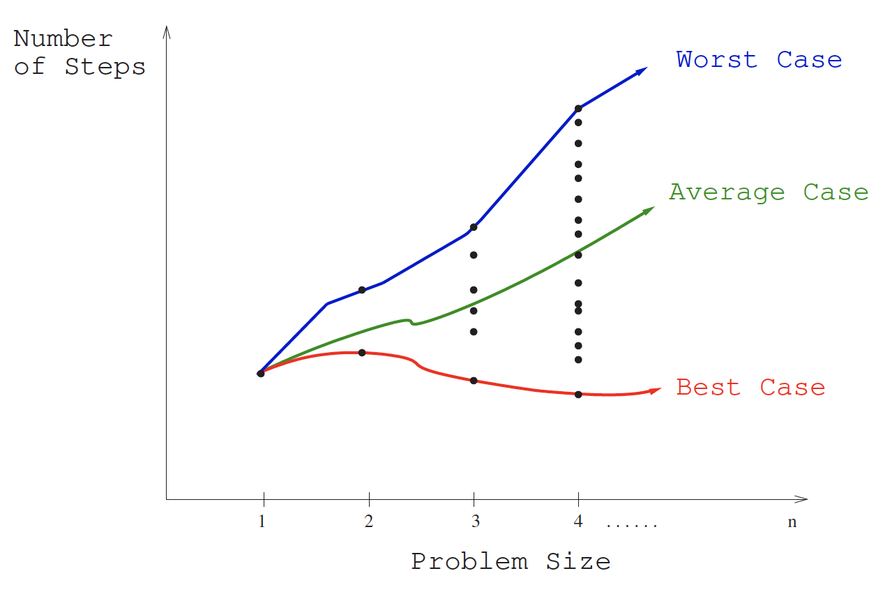 - Best-case: The best-case complexity of the algorithm is the function defined by the minimum number of steps taken in any instance of size . This represents the curve passing through the lowest point of each column.