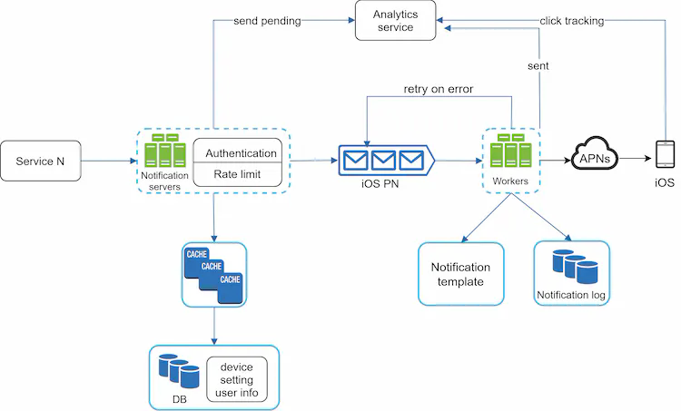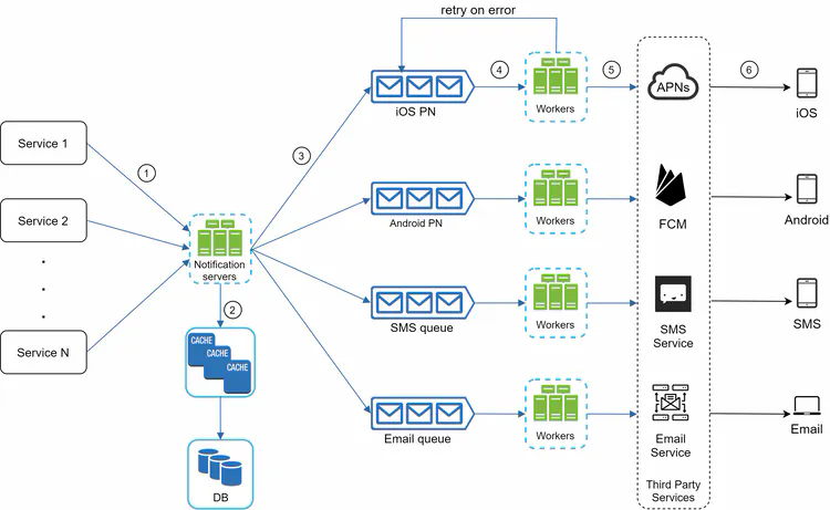 - Notification servers fetch metadata such as user info, device token, and notification setting from the cache or database.