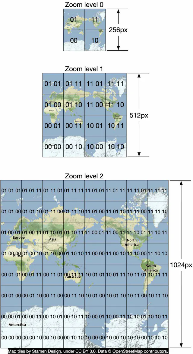 There are distinct sets of tiles at different zoom levels. The client chooses the set of tiles appropriate for the zoom level of the map viewport on the client. This provides the right level of map details without consuming excess bandwidth. To illustrate with an extreme example, when the client is zoomed all the way out to show the entire world, we don’t want to have to download hundreds of thousands of tiles for a very high zoom level. All the details would go to waste. Instead, the client would download one tile at the lowest zoom level, which represents the entire world with a single 256x256 pixel image.