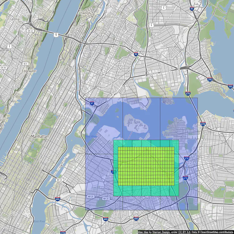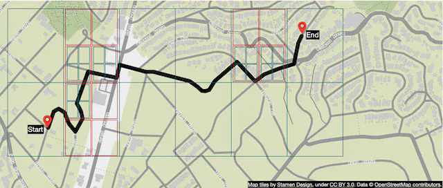 In Figure 5, we call these grids routing tiles. Routing tiles are similar to map tiles in that both are grids covering certain geographical areas. Map tiles are PNG images, while routing tiles are binary files of road data for the area covered by the tiles.
