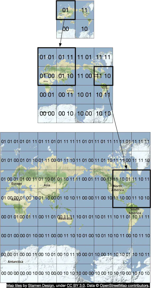 Geohashing is an encoding system that encodes a geographic area into a short string of letters and digits. At its core, it depicts the earth as a flattened surface and recursively divides the grids into sub-grids, which can be square or rectangular. We represent each grid with a string of numbers between 0 to 3 that are created recursively.