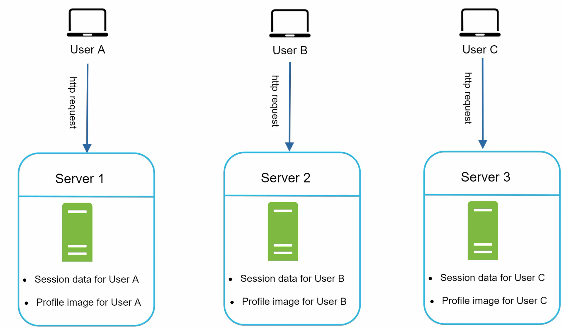 In Figure 12, user A’s session data and profile image are stored in Server 1. To authenticate User A, HTTP requests must be routed to Server 1. If a request is sent to other servers like Server 2, authentication would fail because Server 2 does not contain User A’s session data. Similarly, all HTTP requests from User B must be routed to Server 2; all requests from User C must be sent to Server 3.
