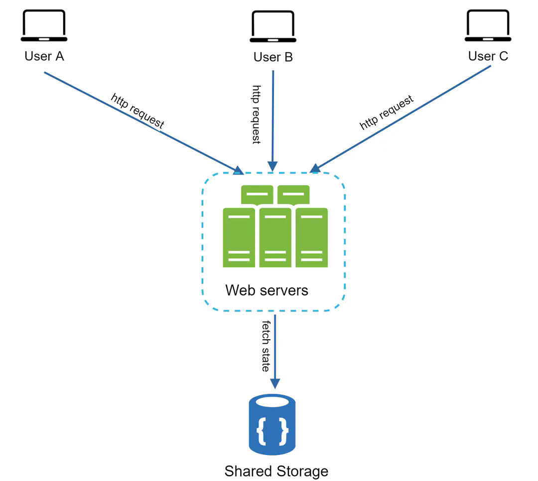 In this stateless architecture, HTTP requests from users can be sent to any web servers, which fetch state data from a shared data store. State data is stored in a shared data store and kept out of web servers. A stateless system is simpler, more robust, and scalable.