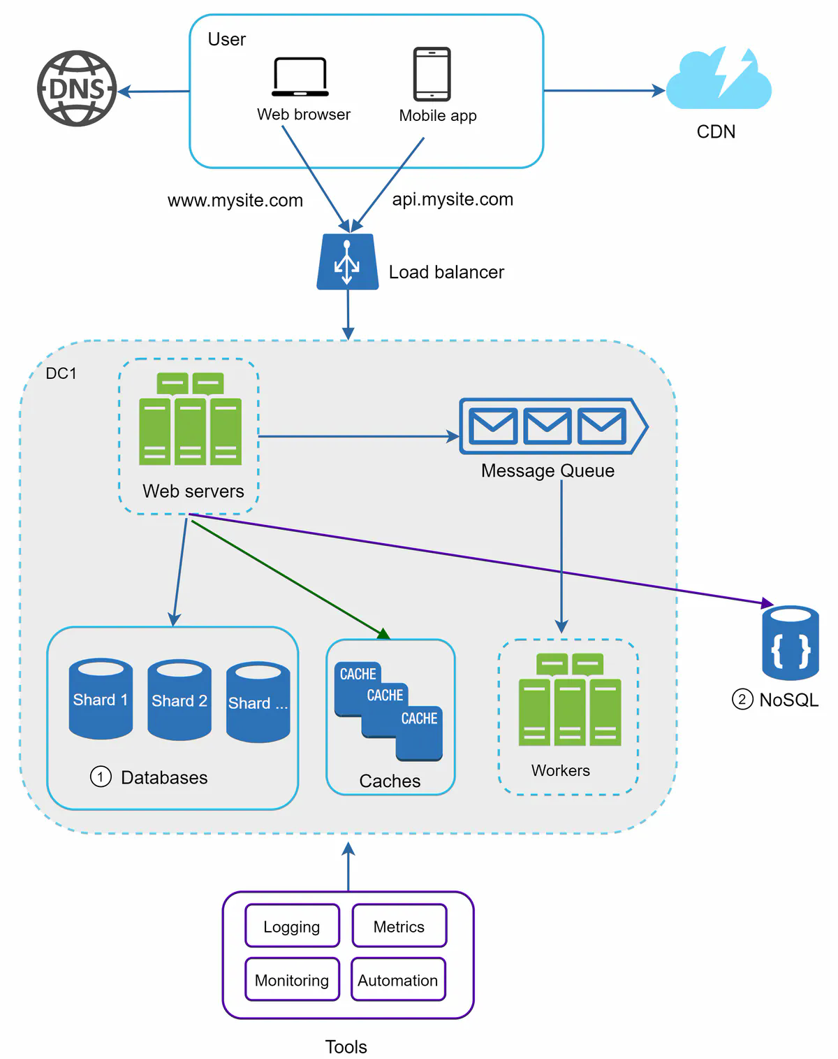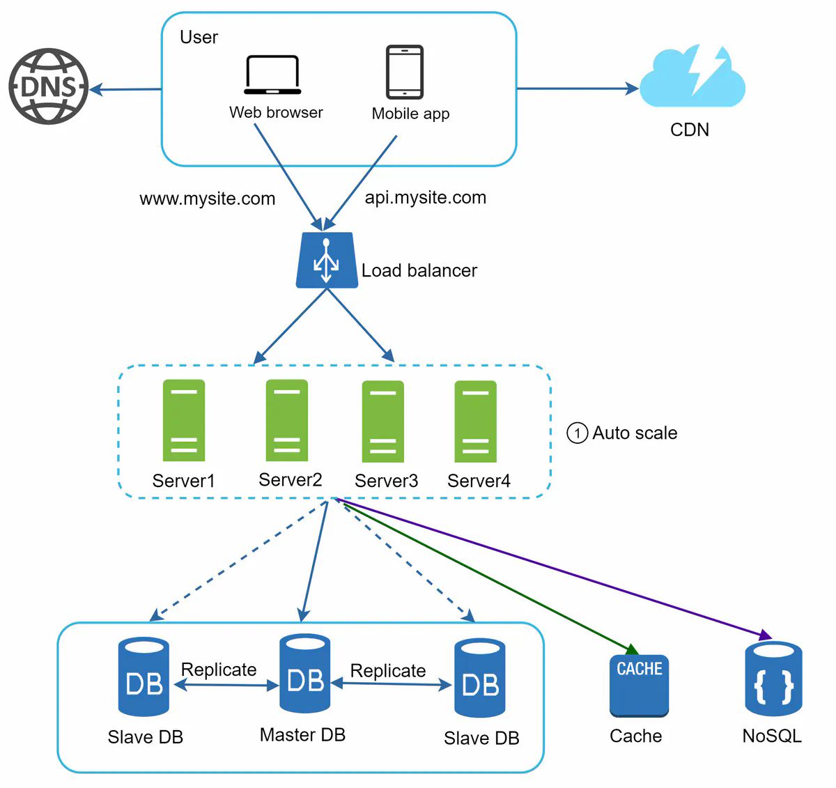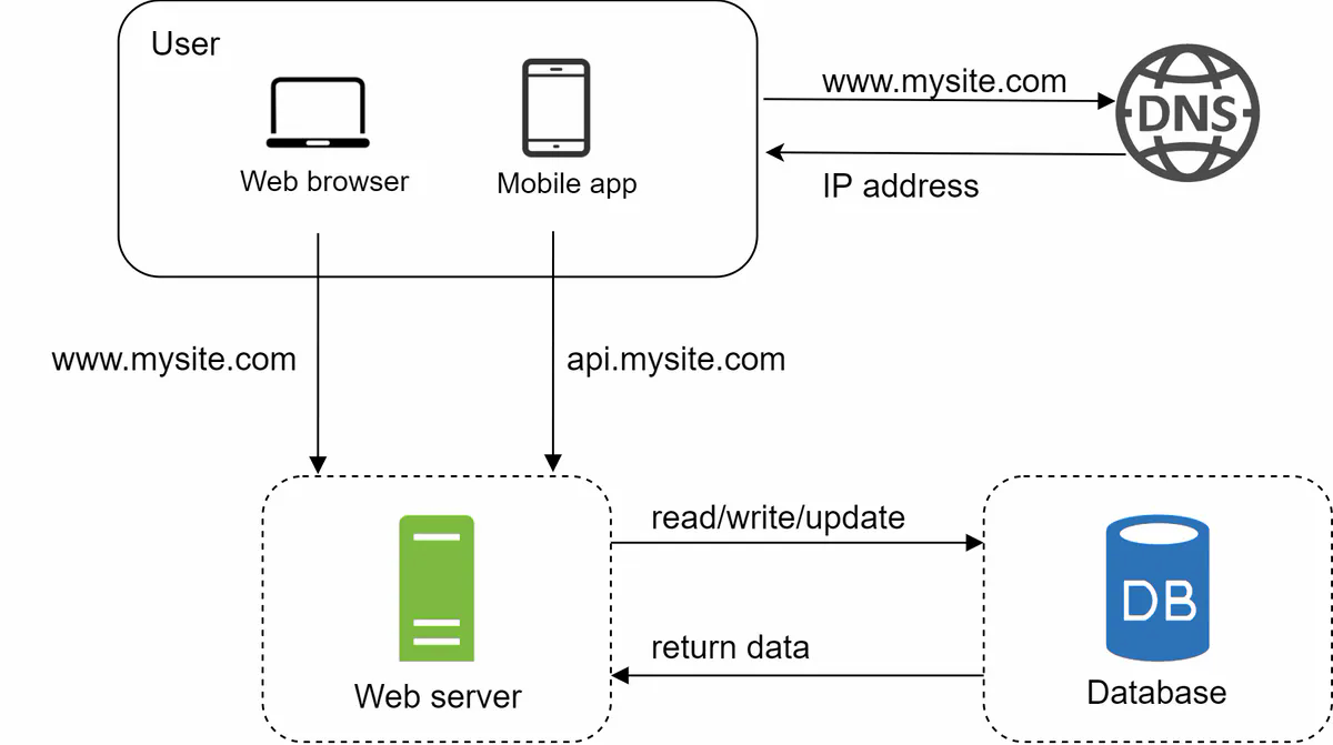 A journey of a thousand miles begins with a single step, and building a complex system is no different. To start with something simple, everything is running on a single server. Figure 1 shows the illustration of a single server setup where everything is running on one server: web app, database, cache, etc.