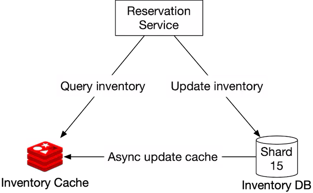 Because the inventory data is updated on the database first, there is a possibility that the cache does not reflect the latest inventory data. For example, the cache may report there is still an empty room when the database says there is no room left, or vice versa.