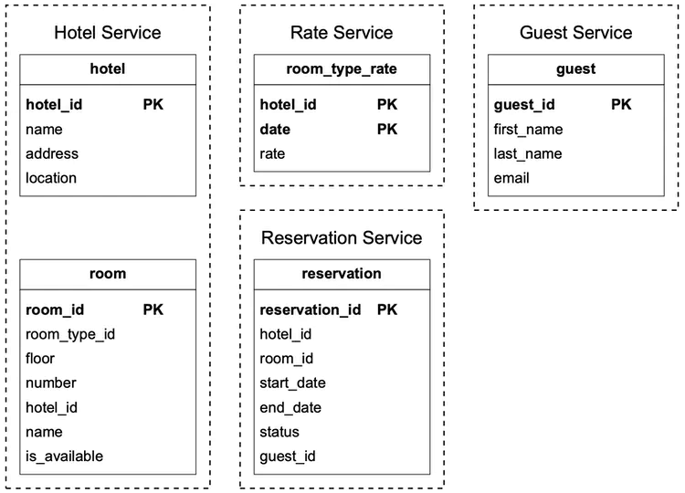 - Reservation Service: receives reservation requests and reserves the hotel rooms. This service also tracks room inventory as rooms are reserved or reservations are canceled.
