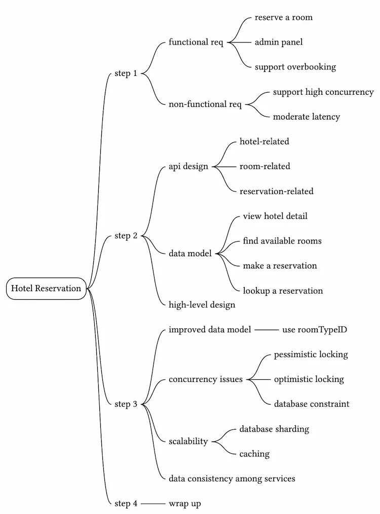 In this chapter, we presented a design for a hotel reservation system. We started by gathering requirements and calculating a back-of-the-envelope estimation to understand the scale. In the high-level design, we presented the API design, the first draft of the data model, and the system architecture diagram. In the deep dive, we explored alternative database schema designs as we realized reservations should be made at the room type-level, as opposed to specific rooms. We discussed race conditions in depth and proposed a few potential solutions: