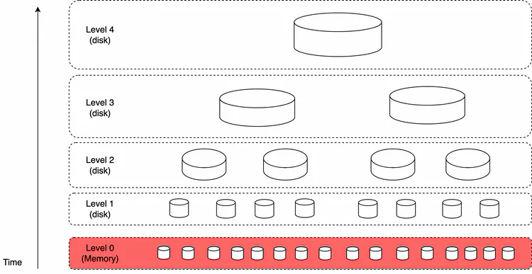 Since the process of building the index is write-heavy, a good strategy might be to use Log-Structured Merge-Tree (LSM) [27] to structure the index data on disk (Figure 11). The write path is optimized by only performing sequential writes. LSM trees are the core data structure behind databases such as BigTable, Cassandra, and RocksDB. When a new email arrives, it is first added to level 0 in-memory cache, and when data size in memory reaches the predefined threshold, data is merged to the next level. Another reason to use LSM is to separate data that change frequently from those that don’t. For example, email data usually doesn't change, but folder information tends to change more often due to different filter rules. In this case, we can separate them into two different sections, so that if a request is related to a folder change, we change only the folder and leave the email data alone.