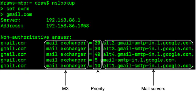 A DNS server is used to look up the mail exchanger record (MX record) for the recipient’s domain. If you run DNS lookup for gmail.com from the command line, you may get MX records as shown in Figure 2.