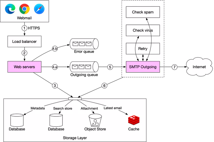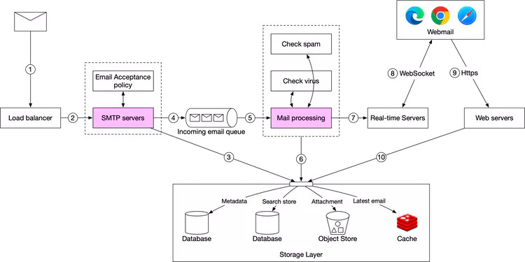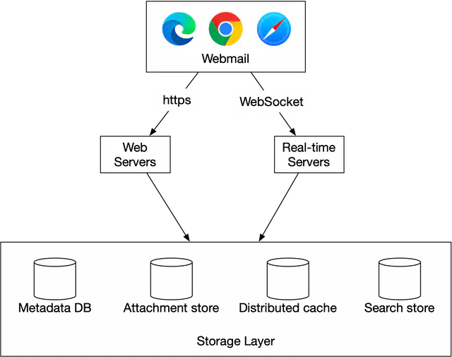 Interviewer: Traditionally, users connect with mail servers through native clients that use SMTP, POP, IMAP, and vendor-specific protocols. Those protocols are legacy to some extent, yet still very popular. For this interview, let’s assume HTTP is used for client and server communication.Candidate: Can emails have attachments?