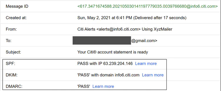 Figure 9 shows an example header of a Gmail message. As you can see, the sender @info6.citi.com is authenticated by SPF, DKIM, and DMARC.