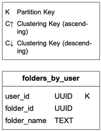 When a user loads their inbox, emails are usually sorted by timestamp, showing the most recent at the top. In order to store all emails for the same folder in one partition, composite partition key <user_id, folder_id> is used. Another column to note is email_id. Its data type is TIMEUUID [17], and it is the clustering key used to sort emails in chronological order.