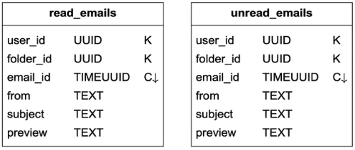 This problem is commonly solved with denormalization in NoSQL. To support the read/unread queries, we denormalize the emails_by_folder data into two tables as shown in Table 4.